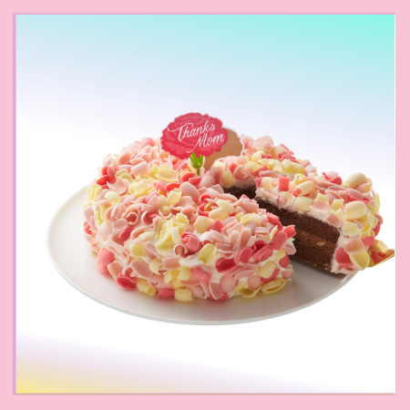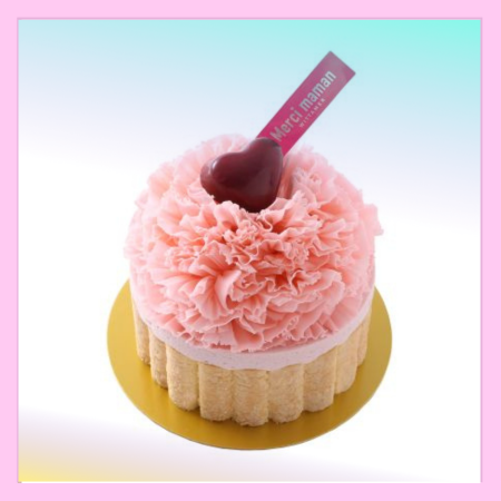 チョコレートスポンジで、チョコレートクリームとウォールナッツを挟み、クリームシャンティでナッぺしたケーキを、 白、ピンク、赤色の3色のチョコレートで包みました。 カーネーションをイメージしたかわいらしいケーキです。