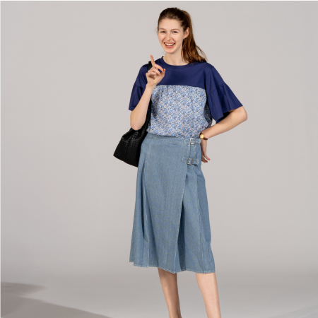 リバティプリントをドッキングしたカットソープルオーバー。Tシャツにビスチェを重ねたようなデザインがポイント。ゆったりシルエットで快適な着心地も魅力的。