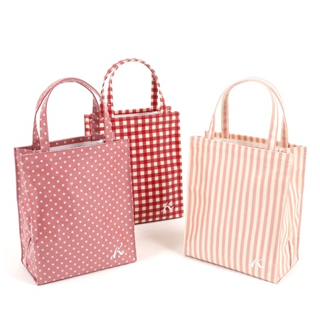 シンプルなデザインと使い勝手の良さで人気のショッピングバッグ。ビニールコーティングされており、水滴や軽い汚れの拭き取りができ便利です。ギンガムチェック、ストライプ、ドット柄で選ぶ楽しさも。底板付きで型崩れしにくく、安定感があるのも嬉しいポイント。