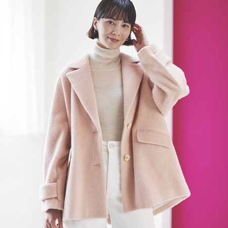 ミドル丈コート。アルパカ混で毛足の長いリッチなシャギーの素材感がポイント。ゆったりラフなボトムでカジュアルダウンして。