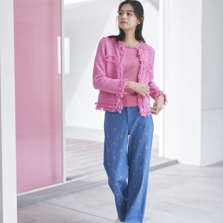 4種類の異なる素材を組み合わせ、ツィード調に編みあげたニットジャケット。目の覚めるような鮮やかなピンクに、フラワー刺しゅうをちりばめたデニムでよりエレガントに。