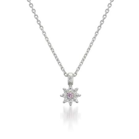 花が芽吹く情景を想起させるよう、中心に希少価値が高い天然ピンクダイヤモンドをセットし、さらに周りをダイヤモンドで取り巻いた“HALO”ネックレス。