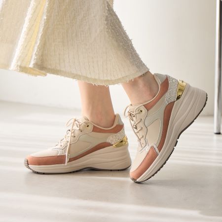 きらきらと輝くグリッターやメタルパーツが女心をくすぐるデザインで、弾力性のあるソールは7㎝のヒールを感じさせない履き心地。楽に履けて、フェミニンなコーディネートにもしっくりハマる、すっきりとしたシルエットにこだわりました。パンプス派にもスニーカー派にもおすすめ一足です。