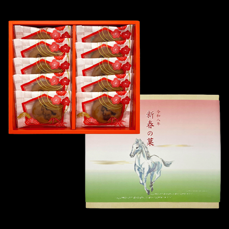 草原を駆ける馬の姿をイメージして、抹茶羊羹と半小豆羊羹を重ね合わせた二層仕立ての「干支羊羹 午」。アーモンドとバターの風味を生かした生地に白桃の果肉をあしらった「白桃フィナンシェ」。口どけよく仕上げたミルク餡を、しっとりとした生地で包んだ「お多福面」。洋風せんべいになめらかなクリームを挟んだ「福渡せんべい」。縁起菓子、吉祥菓子を新年のご挨拶にいかがでしょうか。