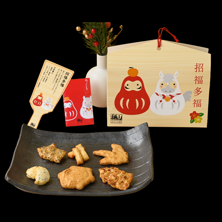 毎年変わる干支ダルマのデザインが愛らしい絵馬型のデザインパッケージ入りおかきセット。おめでたい鶴亀せんべいやぽち袋に入った「ぽちおかき」など、お年賀にぴったりの縁起づくしなお詰合せです。