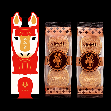 2026年の干支「午」をはじめ、「富士山と初日の出」「松竹梅」など、お正月を華やかに彩る縁起の良い絵柄を描いたえびせんべいと、えびの濃厚な旨みが楽しめる「赤えび炙り焼き」を詰め合わせました。 また、「今年もよろしくお願いします」のメッセージ入りえびせんべいも入っており、年末年始のご挨拶やお祝いにおすすめです。