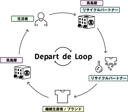 サステナブルな循環型社会の実現を目指した高島屋のプロジェクト「Depart de Loop(デパート デ ループ)」。 繊維原料などに再資源化して、新しい服やモノに生まれ変わらせます。