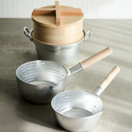 整然と並んだ美しい槌目に、大正13年の創業時から代々受け継がれてきた手打ちの技巧が宿る〈姫野作.〉の鍋。伝統技法で造った本格仕様のせいろと合わせて日々のお料理に。