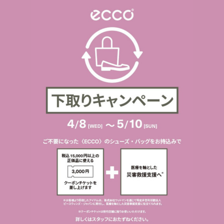 北欧発・コンフォートシューズブランドエコーでは、期間中、『下取りキャンペーン』を開催いたします。ご不要になりましたエコーのシューズ・バッグをお持ちいただきましたお客様に、当日からお使いいただける「3,000円のクーポンチケット」とお引替えいたします。
