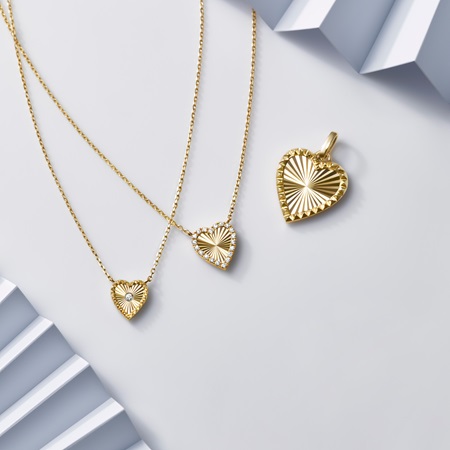 ティングされた地金のテクスチャーが美しく輝くETCHED HEART。“ギョーシェ彫り”の技法で、レディライクなデザインながらも甘くなりすぎず、クールでスタイリッシュな印象に仕上がります。