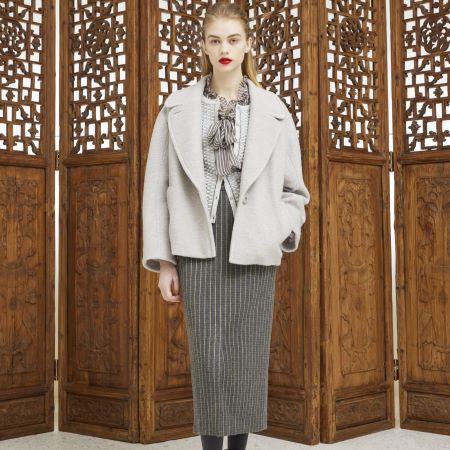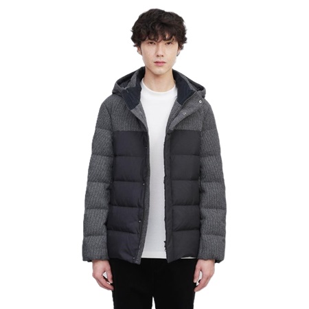 ソリッドな合繊とウール調素材の配色切り替えが特徴のダウンブルゾン。身体に合わせた立体的なパターンによりすっきりとしたシルエットに設計しています。