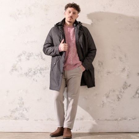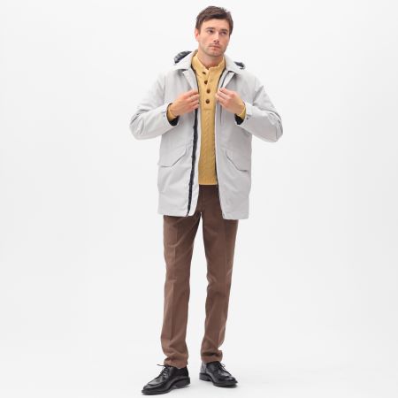 二重織りの生地なので独特な膨らみ感がありとカチオン糸を使用し 見え感杢調になりウオーム感が感じられます。 取り外し可能なライトダウン付きで、端境期から真冬までロング シーズン着回しが可能です。