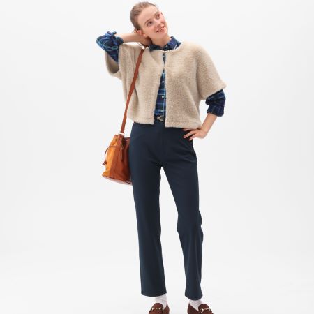 ナイロンとポリエステルを使った糸のシャギー素材は、滑らかな風合いが特徴です。ドロップショルダーで抜け感がありつつ、ボレロ風のアウターとして着こなせます。