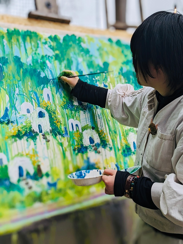 「自然との共存」をテーマに森や生き物を描くライブペインター・おがわさくらさんと一緒に、物語の世界のような「スクラップアート」を作るワークショップ。