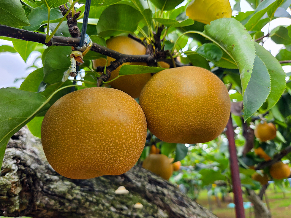 なかには、1893年(明治26年)ごろに神奈川県の梨園で発見されて普及した「長十郎」や、大玉で香りがいい青梨の「かおり」と希少なものも。