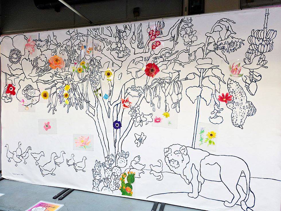 現代美術家・池平徹兵さんの「栢花共生」も大注目。江戸期に1本の木に100の花を咲かせたと伝えられる接木の技術に着想を得た大型展示は、10月12日(日)開催のワークショップ「栢花共生」の参加者と”本気で描いた”コラージュ作品です。