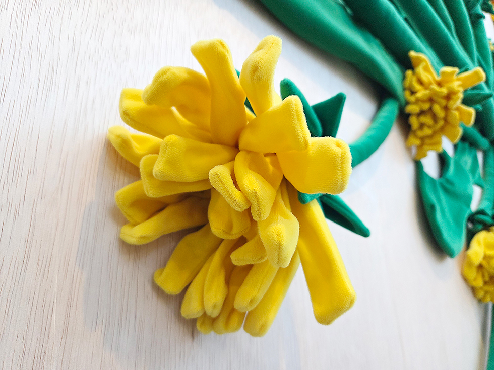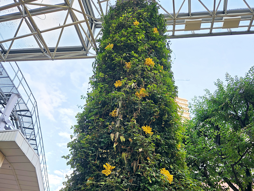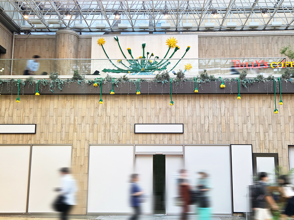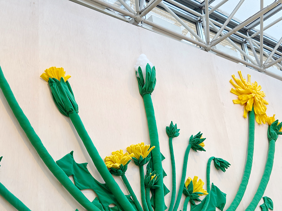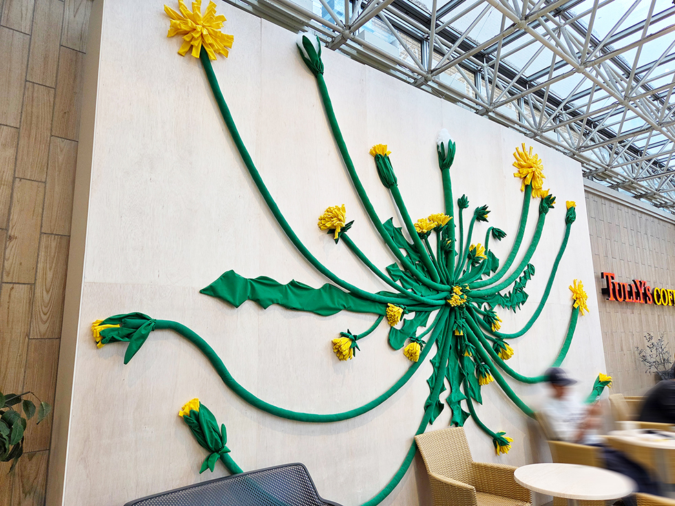 タリーズコーヒー柏モディ店で注文を済ませてテラス席に行くと、ありました! 高さ4~5mほどの白地の特設壁いっぱいに、一株の大きなタンポポ。ロゼット葉からみずみずしい夏葉と茎を伸ばして、黄色いかわいい花を咲かせています。二分咲き、三分咲き、つぼみもたくさん。満開の花や綿毛を付けたものもあります。か、かわいい~♪