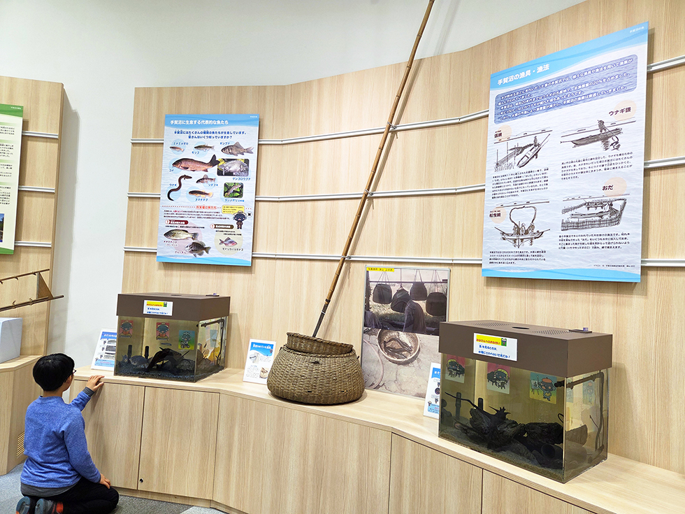 1F正面玄関から入って左側にあるのが、「手賀沼ステーション」。パネルや動画を使った手賀沼の紹介に加えて、実際に生息している魚や植物の実の展示も。小学生の息子は水槽の中に興味津々で、「ウナギがいる!」と江戸時代から続く“手賀沼のウナギ”の歴史を再認識。