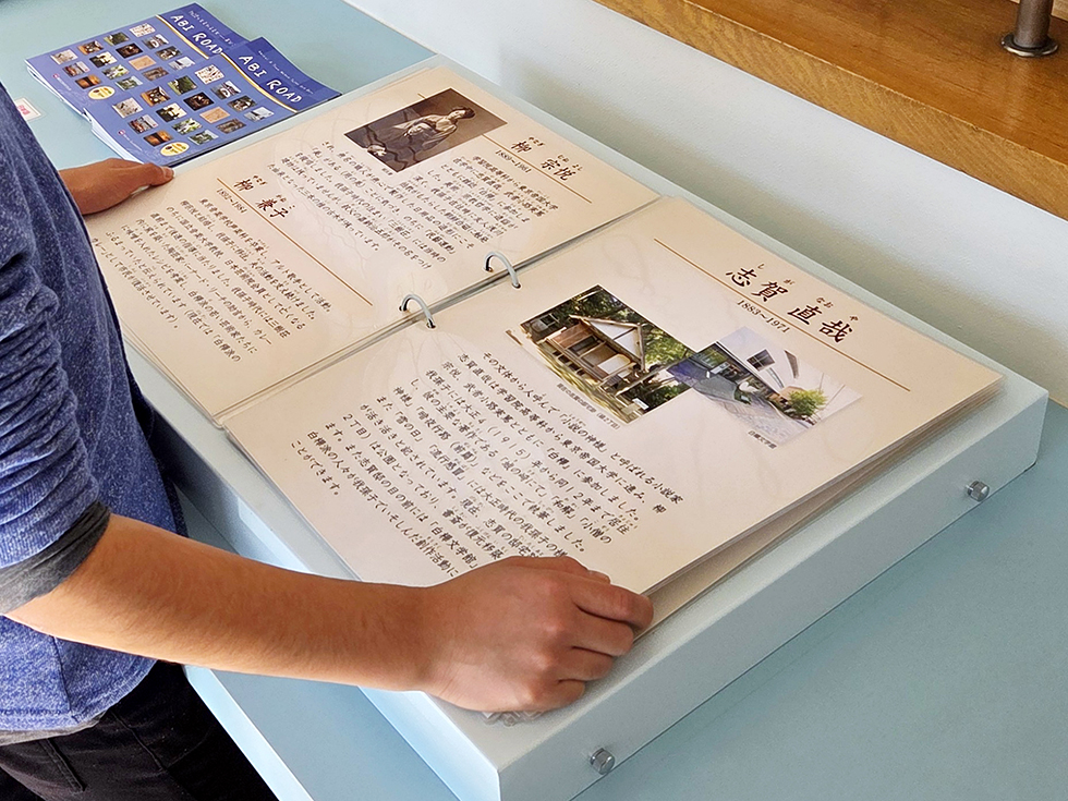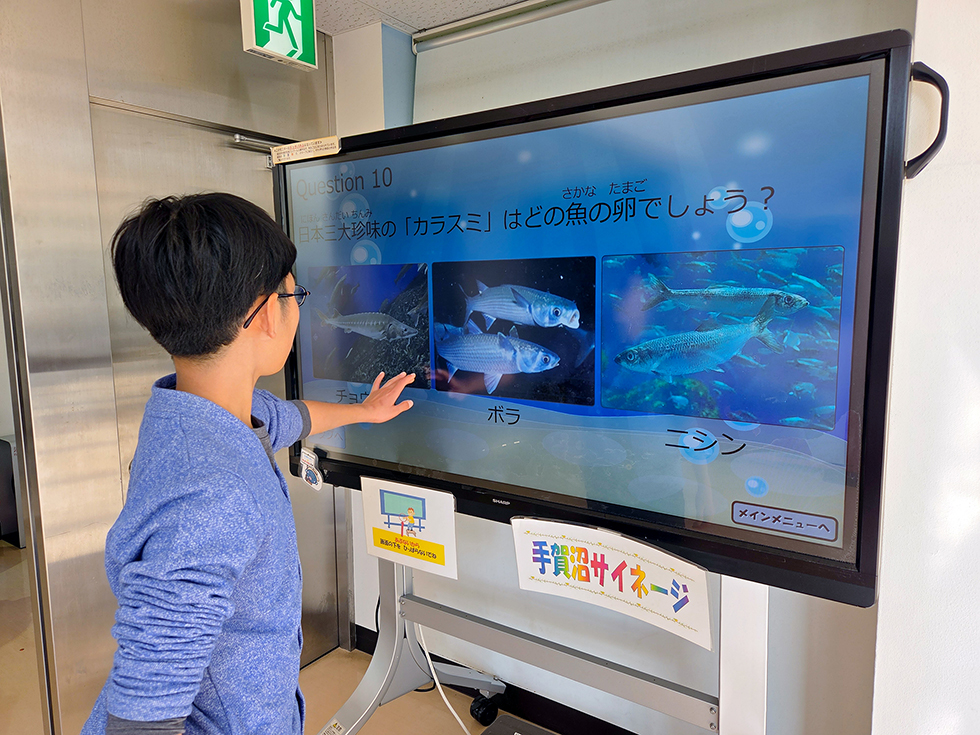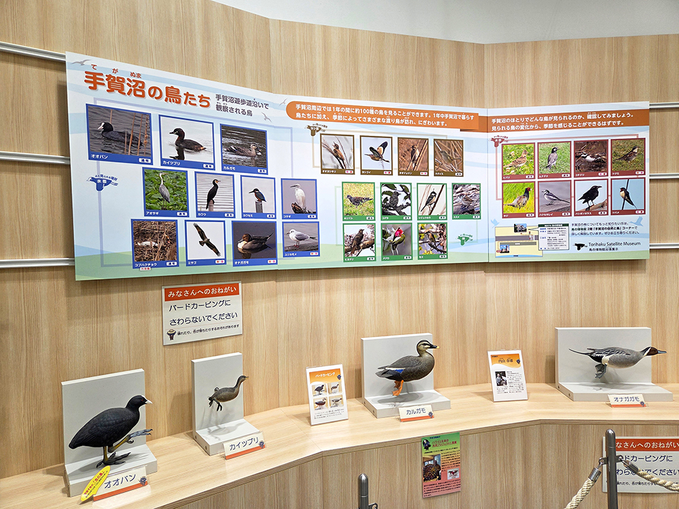 2Fにあがると、めくりアルバムで手賀沼の成り立ちや水質の経緯など、歴史・文化がより深く分かる「手賀沼学習コーナー」があります。我孫子市内で出土した縄文土器のレプリカは、実際に触ってもOK。また「手賀沼サイネージ」では、大画面にタッチして手賀沼に住む鳥や魚に関するクイズにチャレンジ。全問正解できるかな。