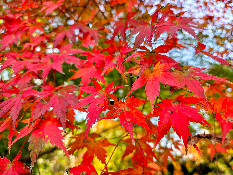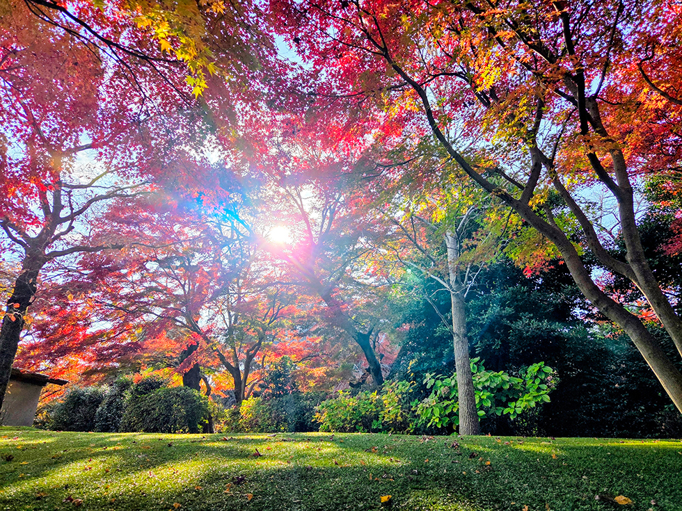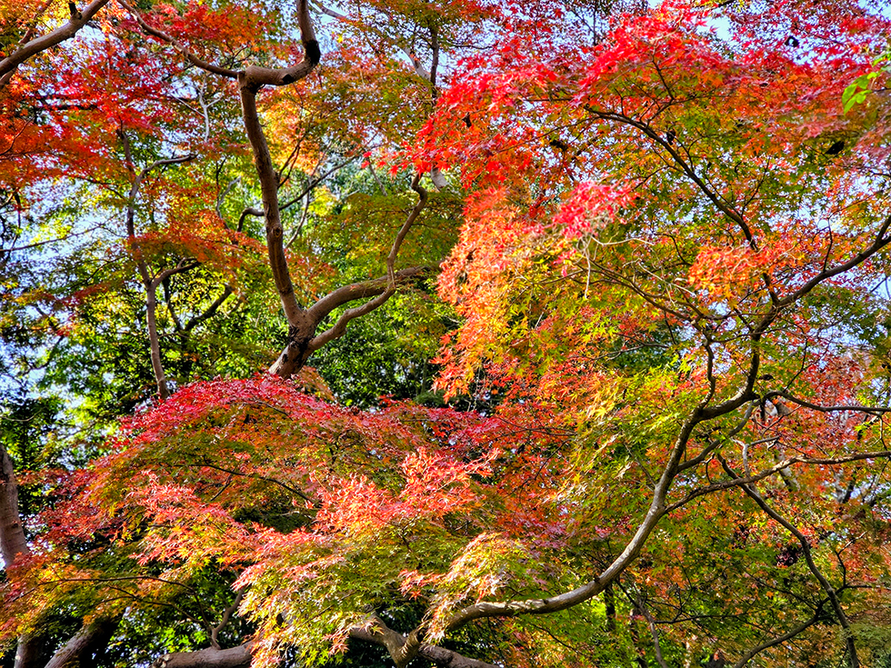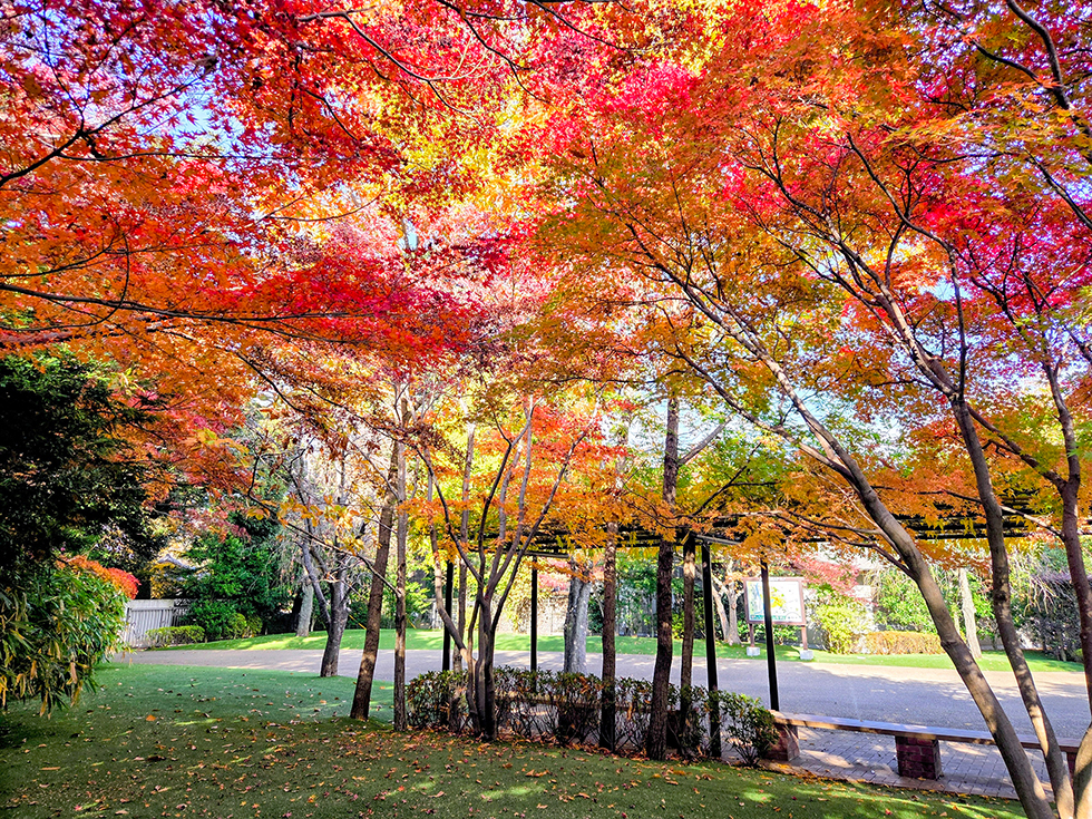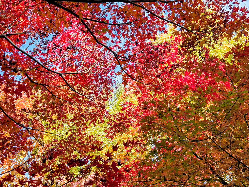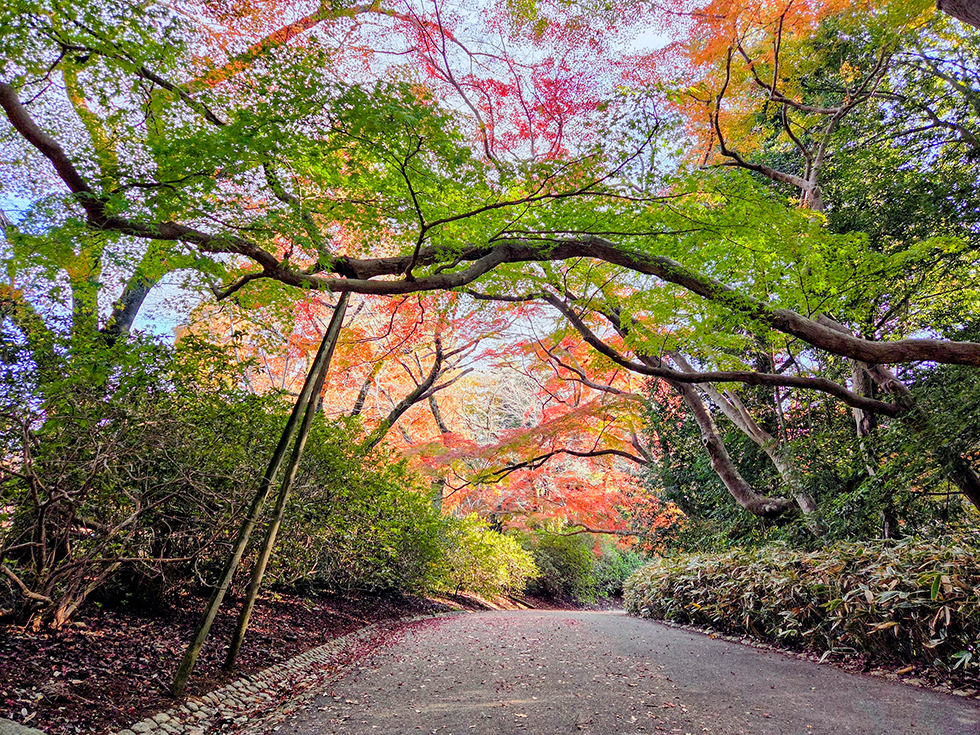撮影した11月20日(木)はピークにはまだ早く、4割ほどの色づきでしたので、赤・黄色・緑のコントラストが見事でした。折り重なった葉が光の加減で見るたびに輝きを変えるのも素敵で、もっと眺めたくて歩くスピードがいつもよりゆっくりに。あれから朝晩の冷え込みも増したので、彩りが進み、まもなく見ごろを迎えるはずです。今年は12月上旬まで楽しめそうですね。