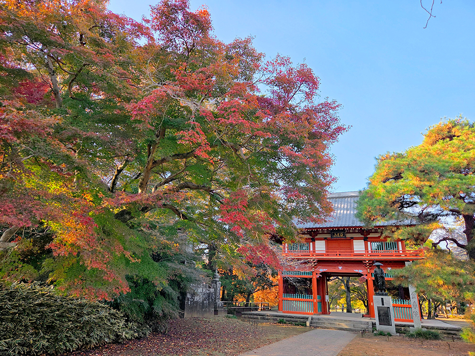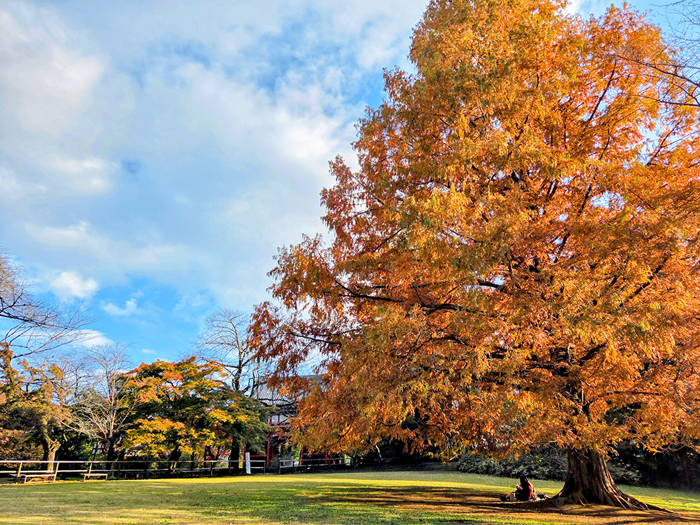 もみじ谷の隣、仁王門が立つひろばには雄大なたたずまいのメタセコイア。左右対称に広がる細長い羽のような葉を、黄色から赤みがかった濃いレンガ色に染めています。初冬の朝日に特に映えることから、別名・曙杉(アケボノスギ)とも呼ばれる巨木は一見の価値ありです。