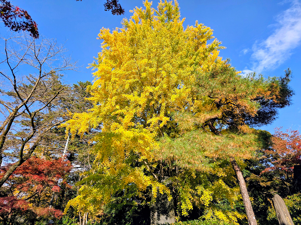 慈光山金乗院の大きなイチョウも、日差しをたっぷり受けて黄金色に色づいています。Cafe アゼリアや総合案内管理事務所に近い、清水公園のメインエントランス付近も天然のグラデーションが映える世界観。低めに仕立てた木も多かったので、色彩美を間近で楽しめますよ。
