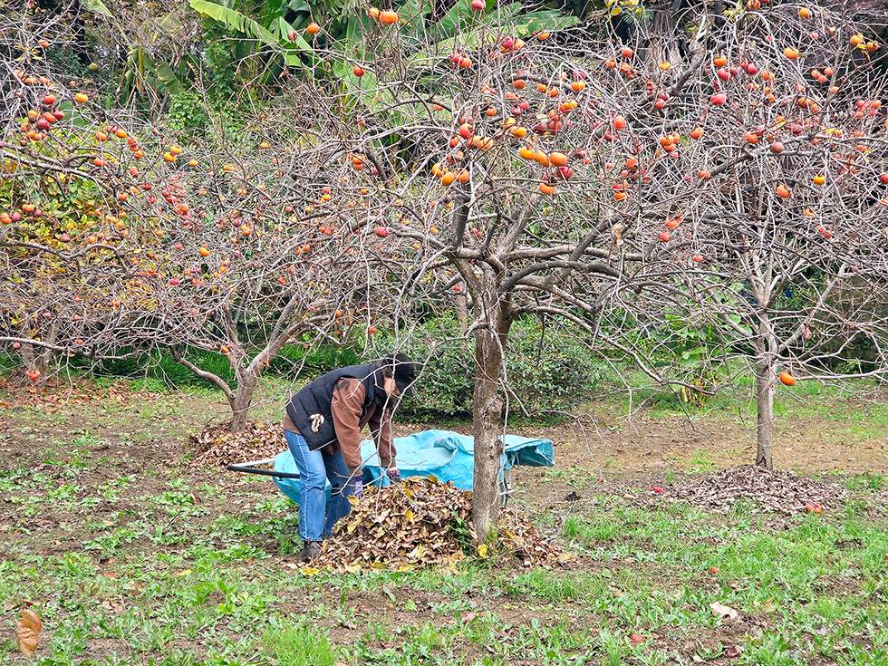 月2回のボランティア活動に集まるのは20人前後。中には毎年、学校行事で田植えや自然学習に訪れる地元・酒井根地区の小学生親子の姿も。この日は清掃と農作業、落ち葉を集め肥料として柿の木の根元にこんもりと。無農薬で守り育てる工夫なのだそうです。