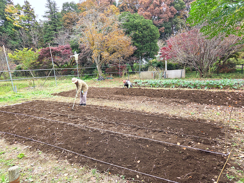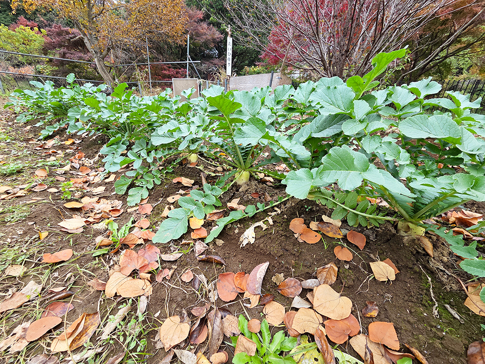 公園内の畑の畝(うね)では、大根が生育中。もう少し太くなったら収穫し、ジャガイモを植えつけます。隣の畝のサツマイモは収穫済みで、連作ができるので耕して次の植え込みを準備します。