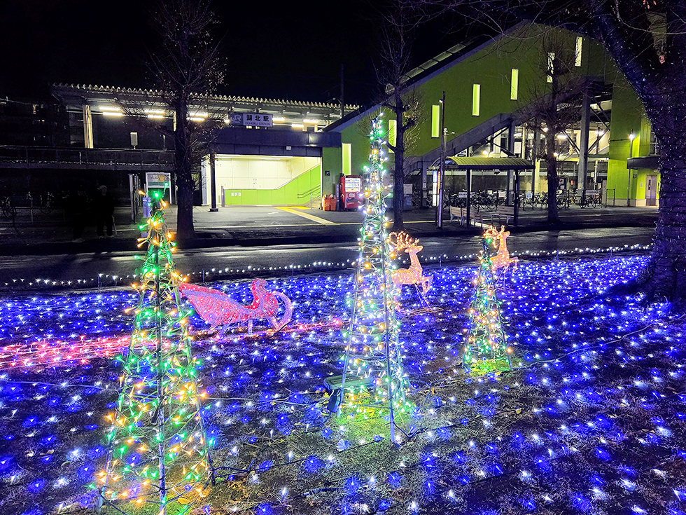 今回は、大注目の季節の催し。成田線湖北駅南口タクシー乗り場に面した、「湖北駅南口ロータリー イルミネーション」(我孫子市湖北台1丁目1)を紹介します。