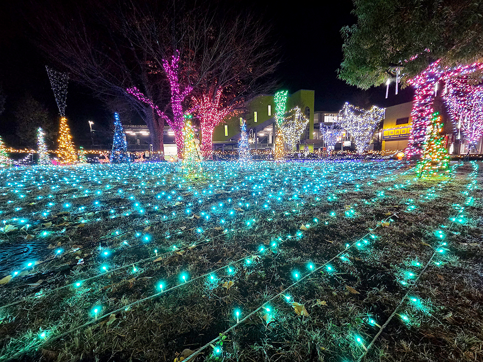 湖北台南口商店会メンバーによるカラフルでダイナミックな電飾の立体演出が、今年も始まりました! 一面に敷き詰めた濃淡のある寒色系の灯りを基調に、ロータリーの中央部分の敷地と植栽を最大限に生かした、映えスポットになっています。