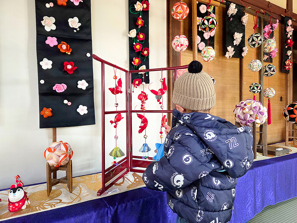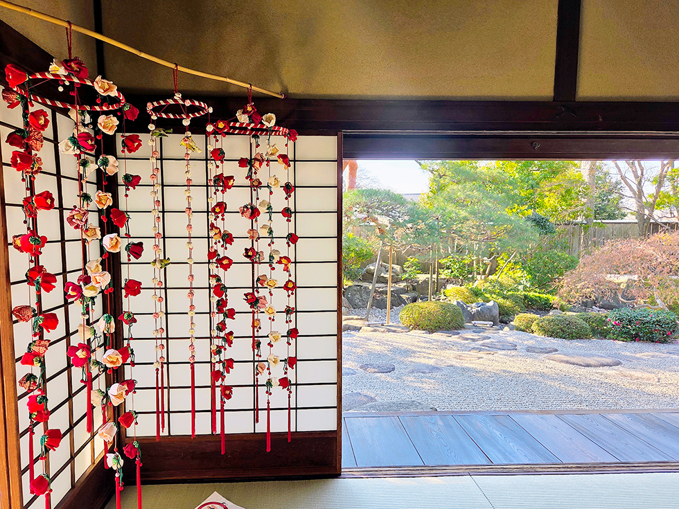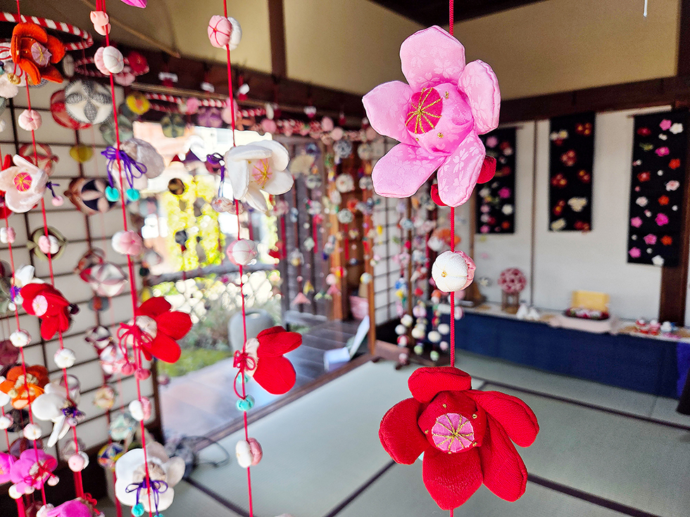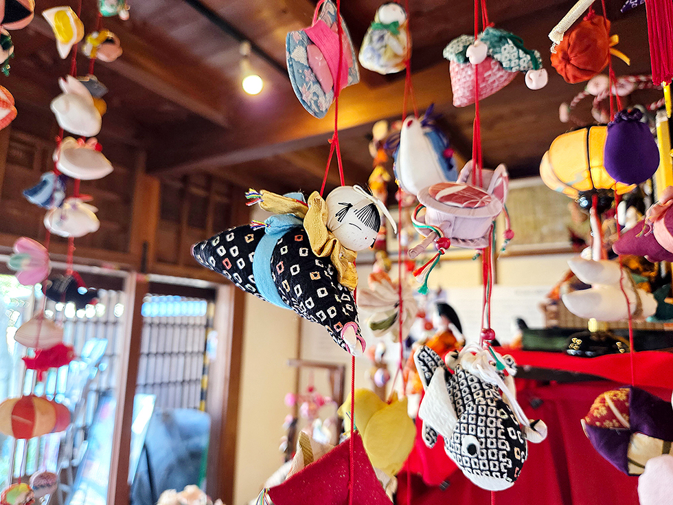 江戸時代に始まったといわれる伝統細工で、生まれてきたこどもの幸せを願いながら手作りします。離れの双樹亭の装飾も素晴らしく、梅や水仙などの季節の花や今年の干支・午(うま)の置物なども。いずれも地元で長年活動している「つるし飾りちくちくの会」の作品で、一つ一つ個性があって愛らしい。