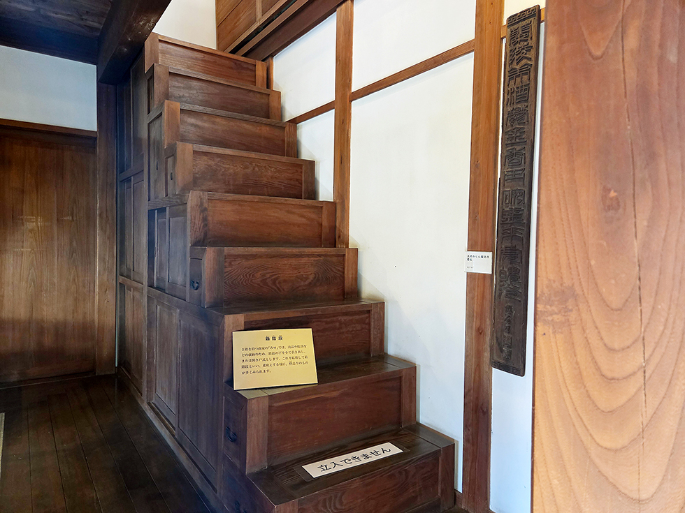 敷地内にある建物のうち、寄棟造り瓦葺き2階建てのこちらが秋元本家。広い「どま」に畳敷きの「みせ」、当時の商家らしい格子戸・揚戸・箱階段などのしつらえも見事です。一茶や双樹ら葛飾派とよばれる俳人についての資料や、流山みりんに関する展示もあって学びになりました。