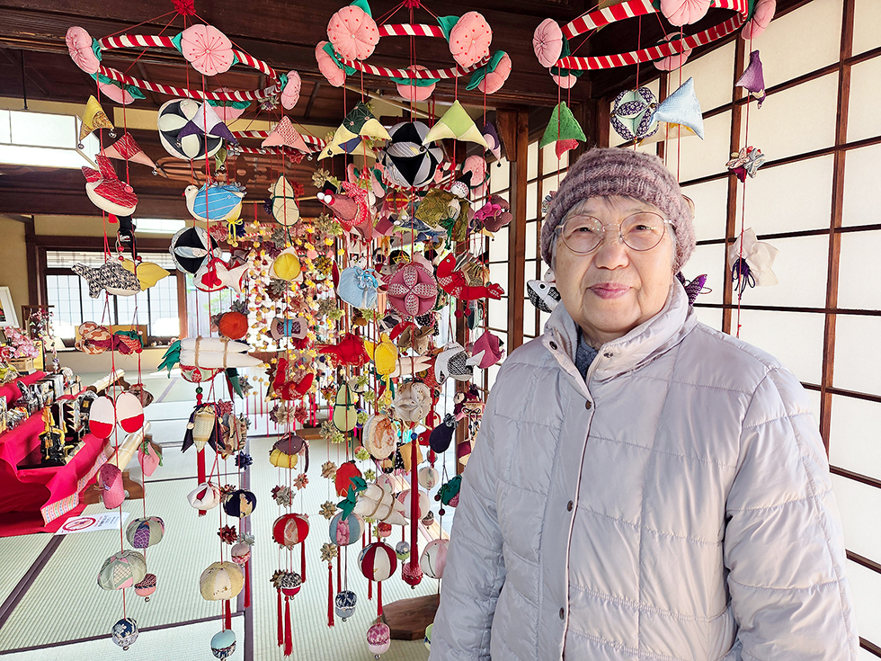 「2014年から展示しています。正絹や化繊の着物や帯、帯揚げ、こどもの着物などを一針一針縫い合わせた飾りは一点物です。見に来てくださった方が笑顔に、穏やかな気持ちになってくれたらうれしい」と、代表の伊藤繁子さん。