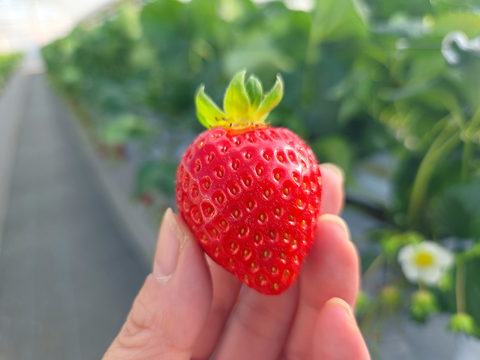 2026年1月上旬から、お待ちかねの「完熟いちご狩り」が始まりました。こちらでは12種類のイチゴのうち、おいしく実った数種類が30分間食べ放題。品種はその日の実り具合でスタッフが4種類ほど選んでくれます。食べ比べができるって、うれしい♪