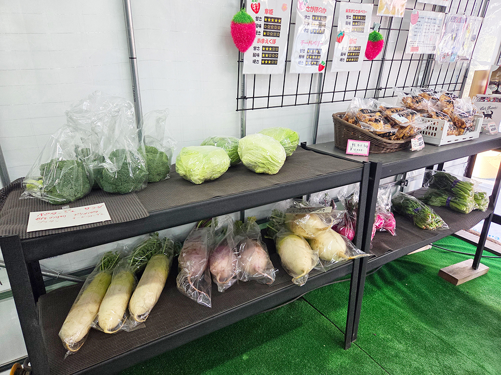 店頭ではパック詰めのイチゴだけでなく、オリジナルのアイスやジャムなどのイチゴ加工品も販売中。また、出荷農家を営む店主のご実家の旬野菜や、自家製もち米を使ったかき餅も。フルーツ狩りと合わせてどうぞ♪