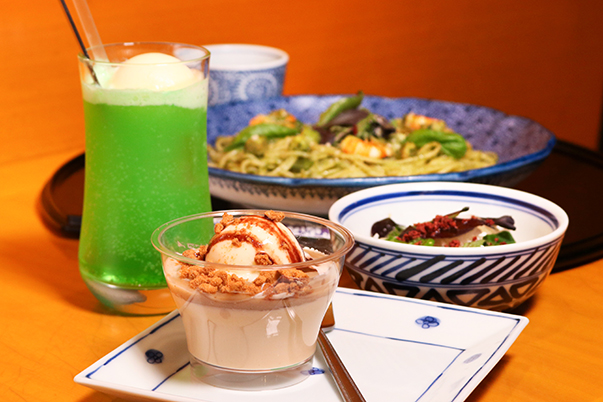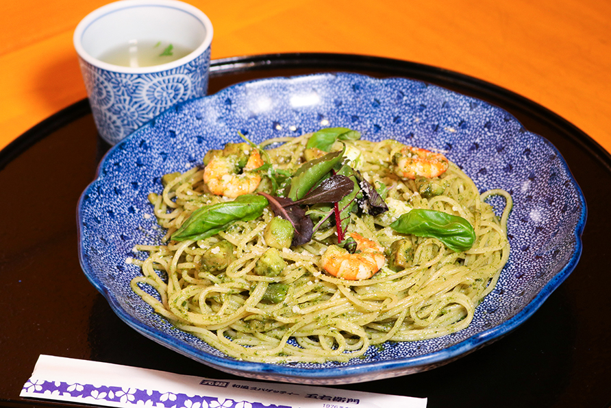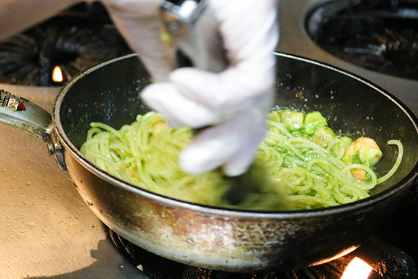 そんな思いで、一皿一皿調理しています。たらこや海苔、ネギなどを使ったり、醤油風味の味付けにしたりなど、和風のアレンジを施したスパゲッティは当店の代名詞ですが、バジルを惜しげもなく使って仕上げたオリジナルのジェノベーゼソースの爽やかさをまとった本品は、スパゲッティ自体の美味しさまで際立たせる推しの一品。安定の人気メニューです! (by スタッフのKさん)