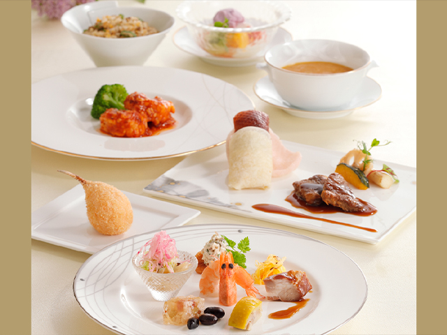 お食事:銀座アスター特製前菜盛り合わせ、ふかのひれと上海蟹のスープ、蟹の爪の広東風揚げ物、大海老の上海風チリソース煮、北京ダックと牛フィレ肉のステーキ、炒飯、やわらか杏仁と紫芋アイスのミニパフェ