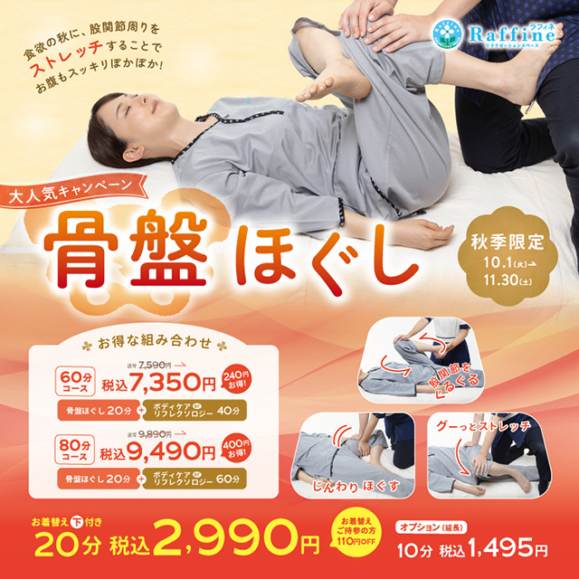 ラフィネプリュスでは、リフレクソロジーやボディケアなどのコースとともに、全身のオイルトリートメントコースをご用意し、ふつうのラフィネよりちょっとだけ贅沢で、「もっと」くつろげる至福のひとときを提供しています。