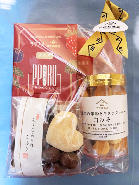 和三盆味のハートのおせんべいがワンポイントに入った「ちょこあられ」や「苺チョコマシュマロ」など、お好きなお菓子を組み合わせてオリジナルのギフトを作ってください♪