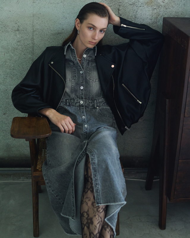 ライダースジャケットを、女性らしいシルエットに落とし込んだ一着。