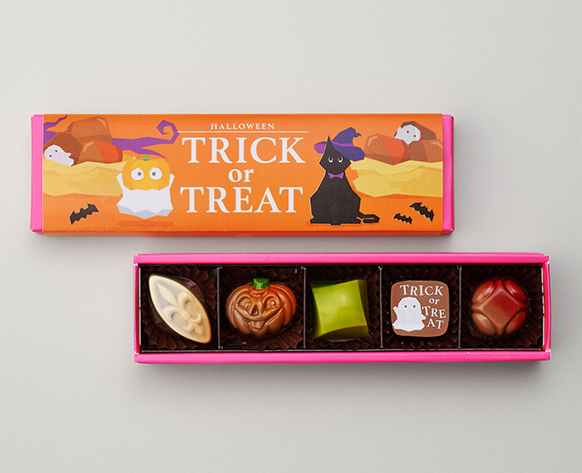 ハロウィーンデザインの箱を開けるとにぎやかに並ぶチョコレートが登場。ハロウィーンパーティーにおすすめです。