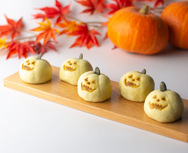 こしあん入りの薯蕷まんぢうにハロウィーンの焼印を押しました。ヘタの部分はかぼちゃの種を使用しています。