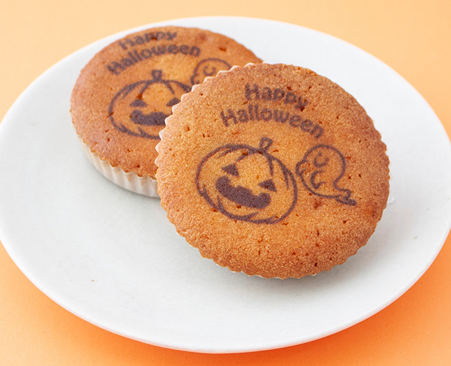カボチャ味のケーキにハロウィーン柄のプリントをほどこしました。