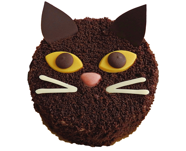 ココアスポンジとたっぷりのチョコレートムースのケーキ。夜に目を光らせる黒猫デザインに仕上げました。