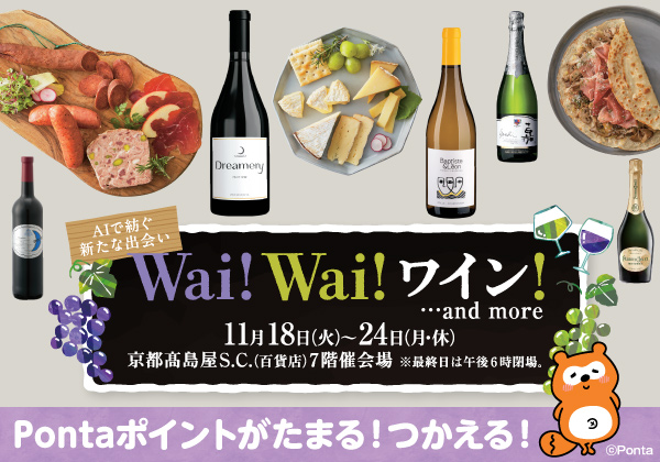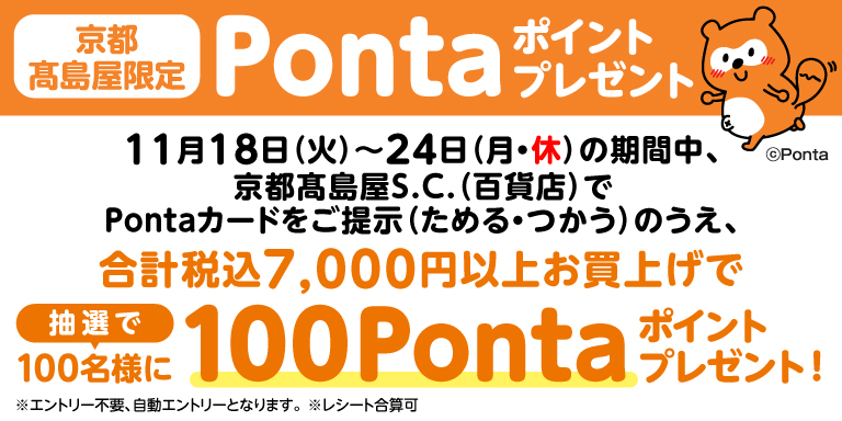期間中、京都高島屋S.C.(百貨店)各階売場にてPontaカードをご提示(ためる・つかう)のうえ、合計税込7,000円以上(合算可能)お買上げのお客様の中から抽選で100名様に100Pontaポイントをプレゼント!