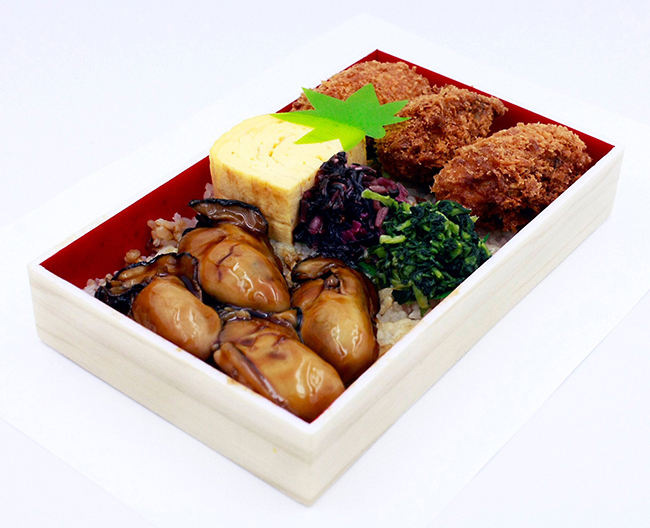 濃厚な牡蠣の旨味が詰まった「かきめし」の上に、瀬戸内海ですくすく育ったぷりっぷりの煮牡蠣と、肉厚なカキフライを詰め合わせたお弁当です。