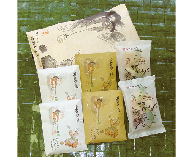 大津絵の図柄が描かれた小袋と、それぞれ個性豊かな風味のあられ・おかきが7種類入った小袋を、1袋に詰合せました。