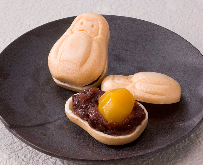 たっぷりのあんこに大粒の栗が丸ごと入った愛らしいだるまさんです。