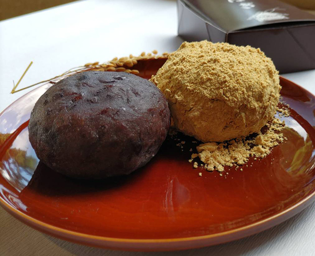 ↑〈葵家 やきもち総本舗〉おはぎ2個入(つぶあん・きなこ) 460円