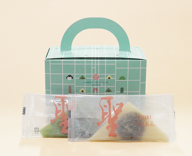 ほどよい甘さのつぶあんを、にっきと抹茶の生八ッ橋で包みました。ひとつずつ個別包装にしています。